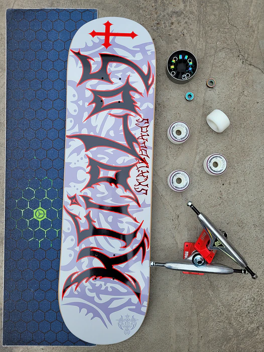 TABLA gotic logo / TRUCK 8.25 red silver / RUEDAS 53mm street black kfls / RODAMIENTOS cronos abec9 Titanio / LIJA osb780 diseño